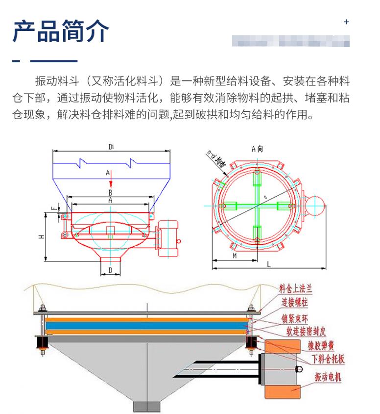 振動(dòng)料斗主要有振動(dòng)電機(jī)、振動(dòng)料斗、活化錐、固定斗等部分組成。