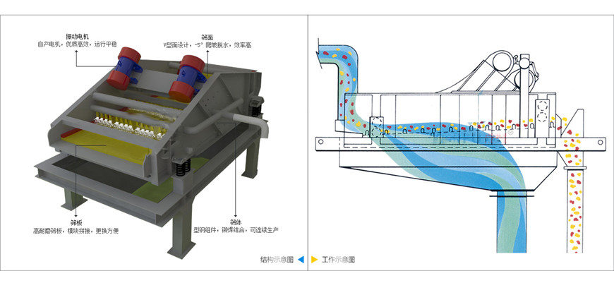 其主要作用是脫水、脫泥、脫介,可用于砂石料廠水洗砂、選煤廠煤泥回收、選礦廠尾礦干排等,因此也叫砂石脫水篩、礦用脫水篩、煤泥脫水篩、尾礦干排篩、高頻脫水篩等。