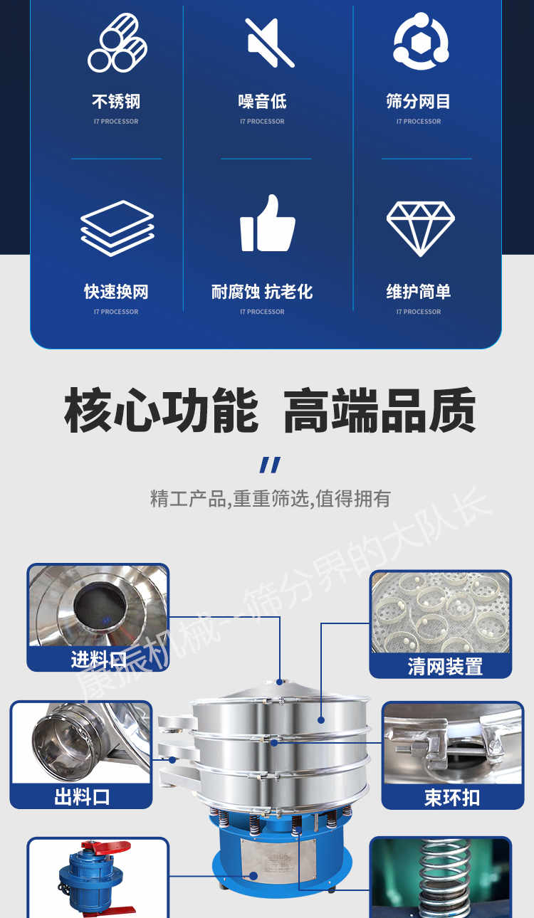 篩選范圍廣--只有系列三次元旋振篩能分選如此廣的原料范圍:任何顆粒、細粉、漿液都可以篩選。篩分細500目(28微米),過濾細5微米。網(wǎng)孔防堵塞--三次元振動功能及自動清理堵網(wǎng)裝置把堵網(wǎng)幾率降到小。 單層或多層分選--每臺旋振篩可選一至五層篩網(wǎng),能同時進行二到六個等級的分選或過濾。