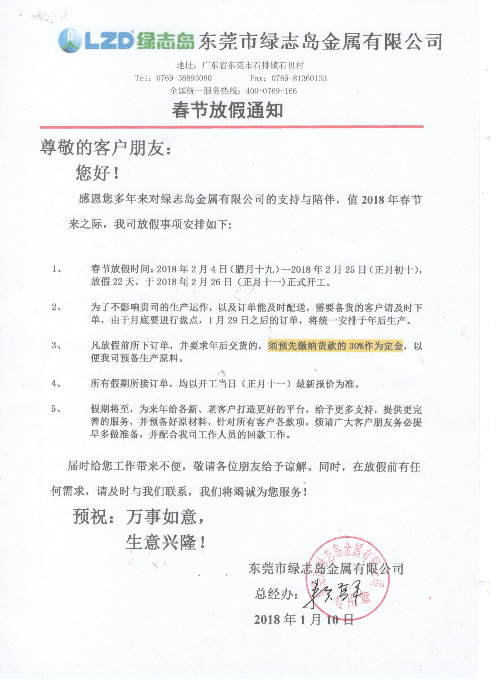 綠志島2018年春節(jié)放假通知