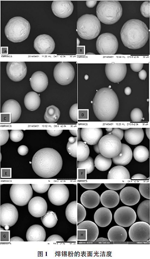 4號(20~38μm)焊錫粉是焊料市場的主流,本文選用不同形貌SnAg3.0Cu0.5的4號焊錫粉與同一種助焊劑配制成焊錫膏進(jìn)行測試。將不同形貌的焊錫粉編號為A~H,焊錫粉放大2000倍的表面光潔度如圖1所示,SEM圖中從A到H焊錫粉的表面逐漸光滑。將A~H焊錫粉與同一助焊劑配制焊錫膏編號為1#~8#,選用綜合性能較好,且已投入生產(chǎn)的A500助焊劑與各種焊錫粉配制焊錫膏。配制焊錫膏的工藝參數(shù)完全相同,即助焊劑A500質(zhì)量百分比11.5%,焊錫粉質(zhì)量百分比88.5%。