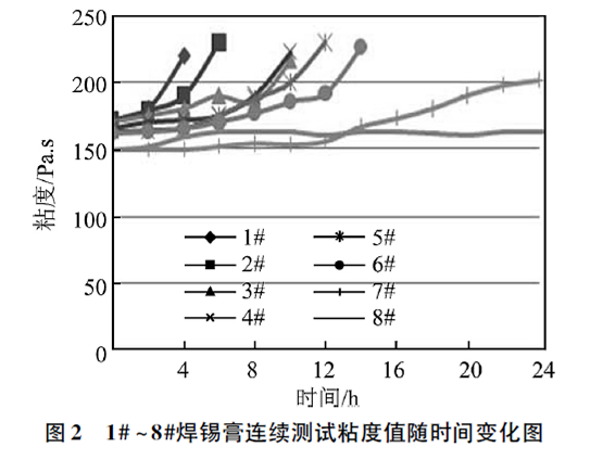 從圖2中看出,8個(gè)焊錫膏樣品的初始粘度均在150~170Pa·s之間,隨著測試時(shí)間的延長,除8#焊錫膏以外其他焊錫膏的粘度均增大。其中1#焊錫膏測試4h后砂化,2#焊錫膏測試6h后砂化,3#、4#焊錫膏測試10h后砂化,5#焊錫膏測試12h后砂化,6#焊錫膏測試14h后砂化,焊錫膏砂化后不再繼續(xù)測試。7#焊錫膏測試12h后粘度值開始增加,但增長速率較為緩慢,8#焊錫膏在24h內(nèi)粘度值很穩(wěn)定。一般來說,焊錫膏的粘度變化幅度越大,出現(xiàn)砂化時(shí)間越短,說明焊錫膏的穩(wěn)定性越差。焊錫膏通常是需要連續(xù)印刷,連續(xù)測試焊錫膏的粘度可以間接判斷焊錫膏在連續(xù)使用過程中的穩(wěn)定性。測試時(shí)間越長,粘度變化越小的焊錫膏印刷時(shí)的穩(wěn)定性越好,反之,焊錫膏印刷時(shí)的穩(wěn)定性越差。