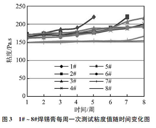 從圖3看出,1#、2#焊錫膏連續(xù)測試不到8周砂化,3#~8#焊錫膏在8周測試時(shí)間內(nèi)未砂化,但3#~6#焊錫膏粘度變化較大,粘度變化超過20%,不利于焊錫膏印刷使用。7#、8#焊錫膏粘度值穩(wěn)定,保質(zhì)期較長。