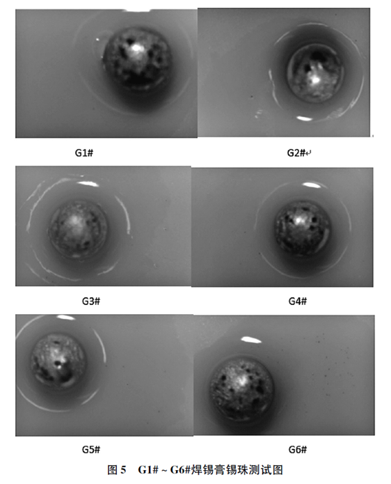 分析焊錫膏G1# ~ G6#所對應(yīng)的焊錫粉F1# ~F6#,其氧含量依次升高,F(xiàn)1#最低50 mg /kg,F(xiàn)6#最高130 mg /kg。由表1、表2 得出焊錫粉氧含量對焊錫膏粘度穩(wěn)定性有一定的影響,焊錫粉氧含量在80 ~ 120 mg /kg 時焊錫膏的穩(wěn)定性較好。按照IPC - TM - 650 2. 4. 43 的試驗方法,以陶瓷片為載體對G1# ~ G6#進(jìn)行了錫珠試驗,試驗結(jié)果如圖5所示。從圖5 看出G1#焊點周邊沒有小錫珠,G2#、G3#、G4#焊點周邊出現(xiàn)了小于5 個的小錫珠,G5#焊點周邊出現(xiàn)了大于10 個的小錫珠、G6 #焊點周邊出現(xiàn)無數(shù)錫珠。由此推斷當(dāng)氧含量超過120 mg /kg 時,焊錫膏穩(wěn)定性雖好,但是焊點周圍產(chǎn)生大量小錫珠。