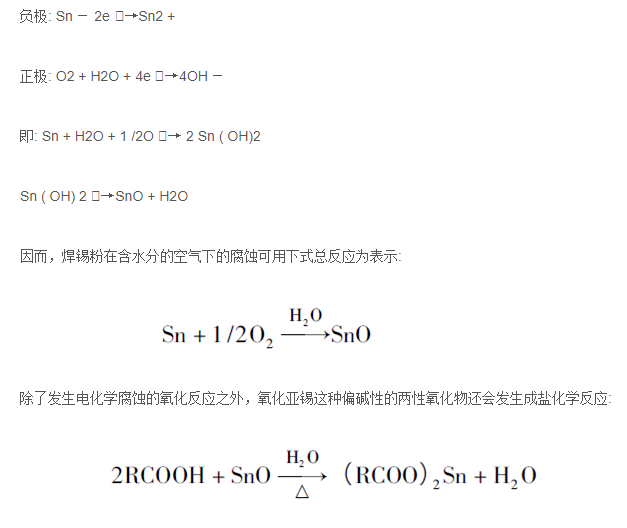 焊錫中除Sn 外還含有Ag、Cu ( 或其他元素)等相比較高電位的金屬,在有助焊劑介質(zhì)的作用下,形成無數(shù)個以Sn 為負(fù)極、Ag /Cu 等為正極的原電池,這就會發(fā)生如下反應(yīng):