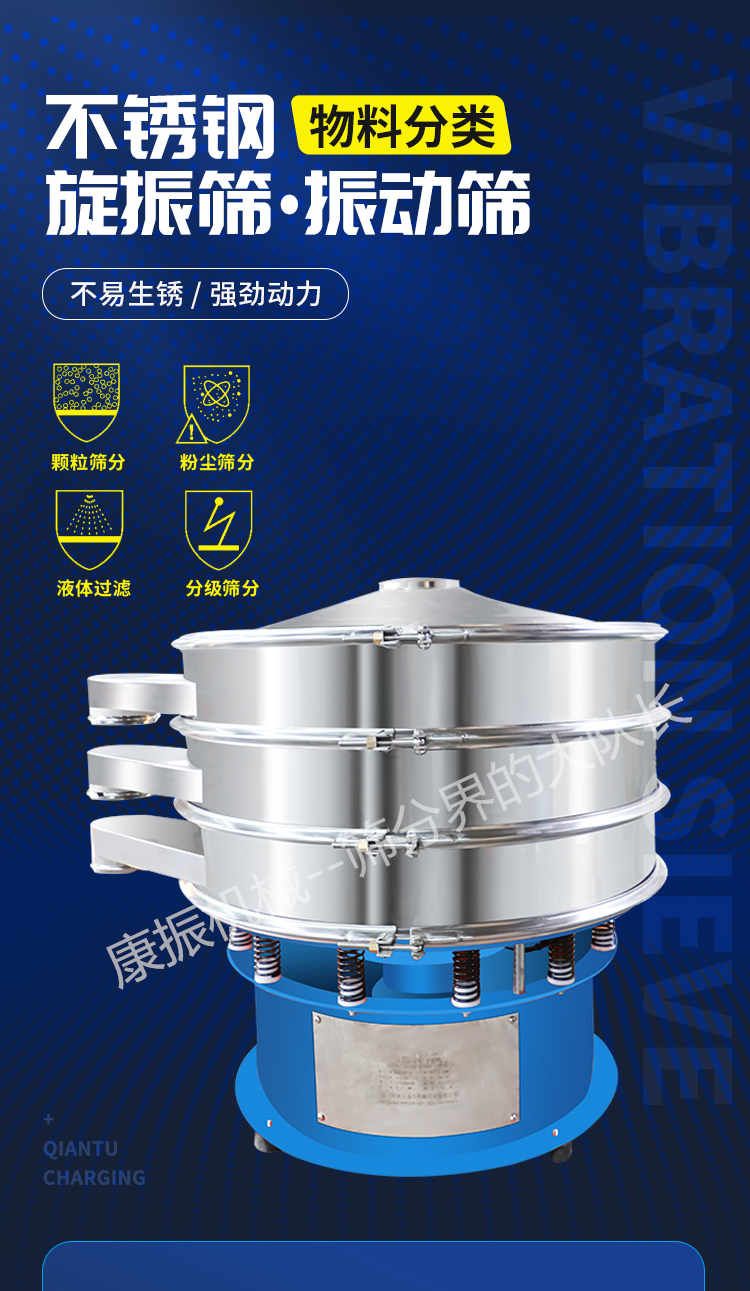 篩選范圍廣--只有系列三次元旋振篩能分選如此廣的原料范圍:任何顆粒、細粉、漿液都可以篩選。篩分細500目(28微米),過濾細5微米。網(wǎng)孔防堵塞--三次元振動功能及自動清理堵網(wǎng)裝置把堵網(wǎng)幾率降到小。 單層或多層分選--每臺旋振篩可選一至五層篩網(wǎng),能同時進行二到六個等級的分選或過濾。